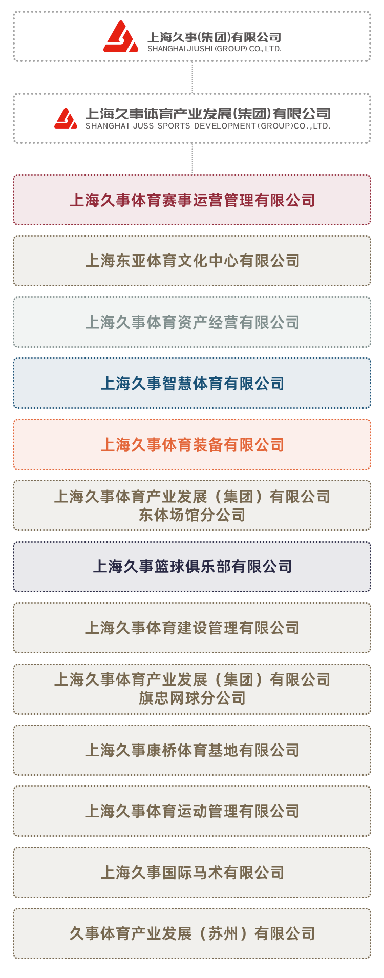 上海久事体育产业发展(集团)有限公司是上海久事(集团)有限公司旗下全资子公司,集聚了众多优质体育资源,是上海体育产业发展水平的重要代表。公司实施1个功能性平台加N个专业化公司的管控模式,主动融入上海乃至全国推动高质量发展、创造高品质生活、实现城市能级和核心竞争力提升的新环境、新战略中,以体育赛事、体育场馆、职业体育、体育科技与服务为主营业务,以体育资产管理为支撑,整合体育资源,延展产业链条,促进产业融合,培育产业生态。